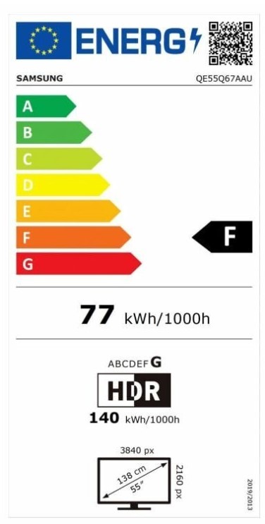 Analizując przedstawiona etykietę dla telewizora SAMSUNG QE55Q67AAU, przy złożeniu że w ciągu roku będzie używany przez 1000 h, czyli średnio licząc Okoł 3 godzin dziennie, roczny koszt wyniesie dla taryfy G11 50,00 zł.